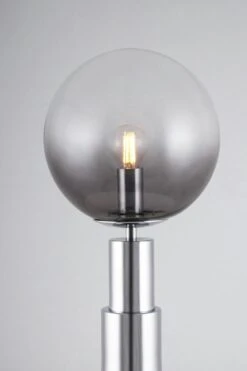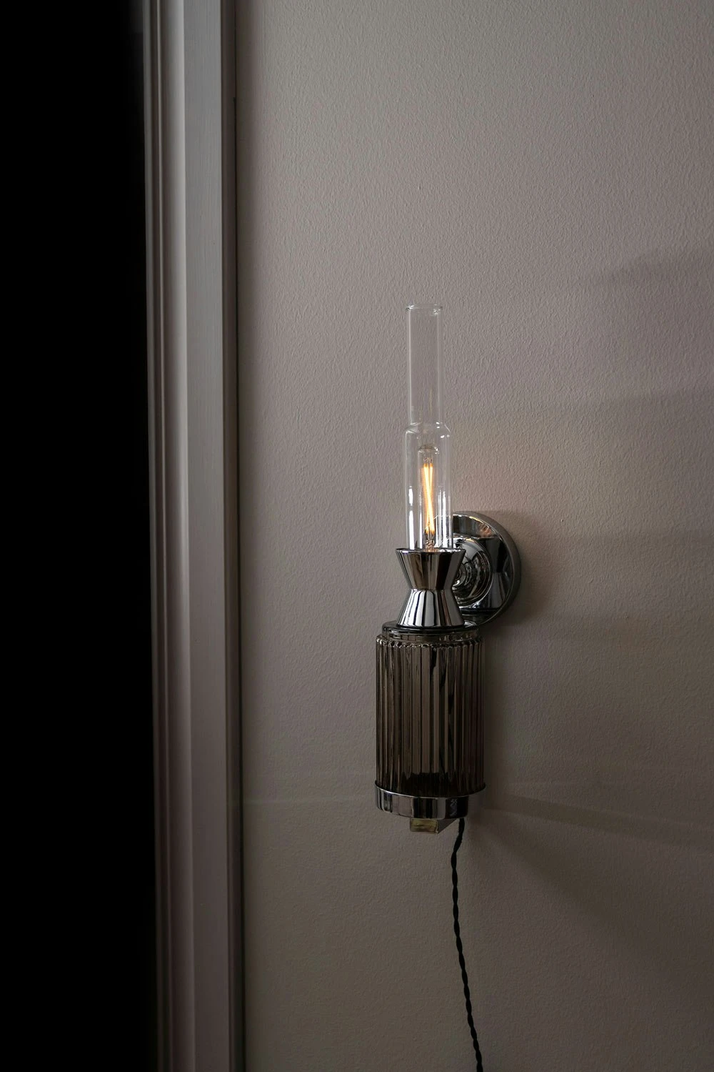 Die Ester Wandlampe hat die Form einer klassischen alten Öllampe und strahlt atmosphärisches Licht aus. Die Lampe ist in Chrom mit rauchfarbenem Rillenglas oder in Messing mit Klarglas erhältlich und verfügt über ein perlmuttfarbenes gezwirbeltes Textilkabel mit Schalter.