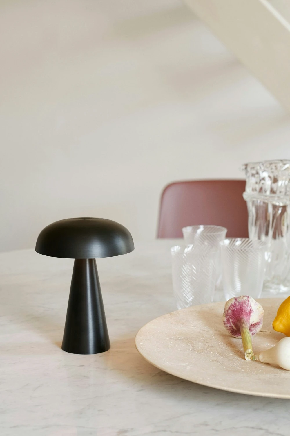 – Tragbares Design mit pilzförmigem Lampenschirm.
